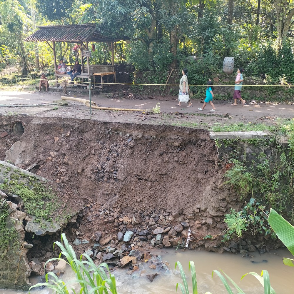 Menurut penuturan sak pemilik rumah, peristiwa terjadi sekitar pukul 10.00 WIB. Saat kejadian, terdengar suara gunturan-gunturan kecil yang berasal dari bangunan tembok sebelah atas. "Saya sedang menggoreng didapur, tiba-tiba ada suara kretek kretek seperti tembok mau ambruk. Seketika itu saya langsung berlari masuk kedalam bangunan rumah utama, selang beberapa detik, tembok bangunan dapur langsung roboh rata dengan tanah. Begitu penuturan dari sang pemilik rumah ibu Tumiyem (66 tahun).